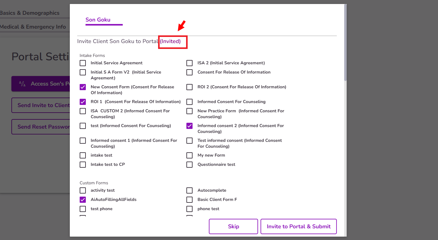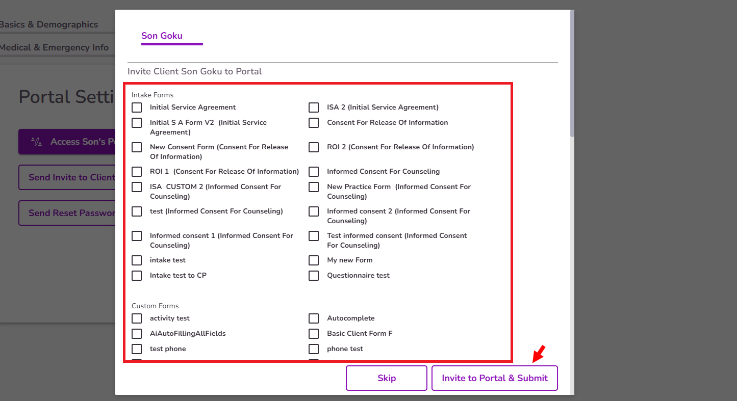 Select the initial forms you’d like to send to the client, then click the Invite To Portal & Submit button