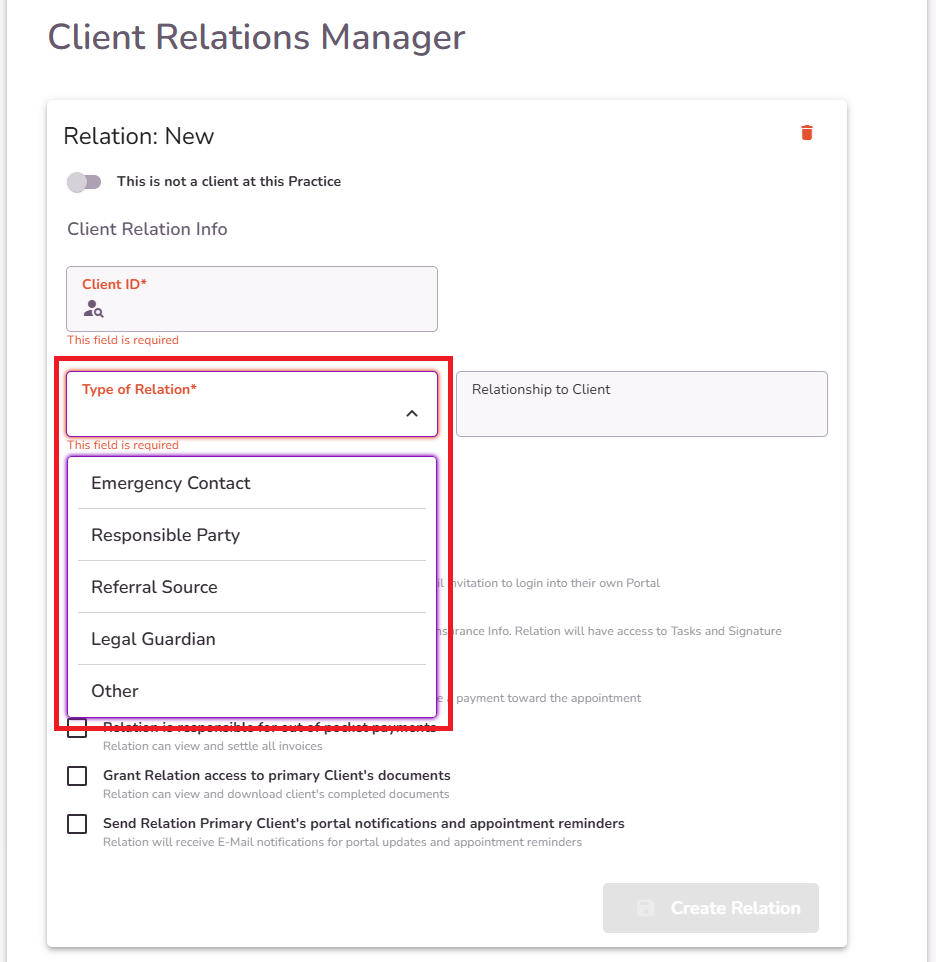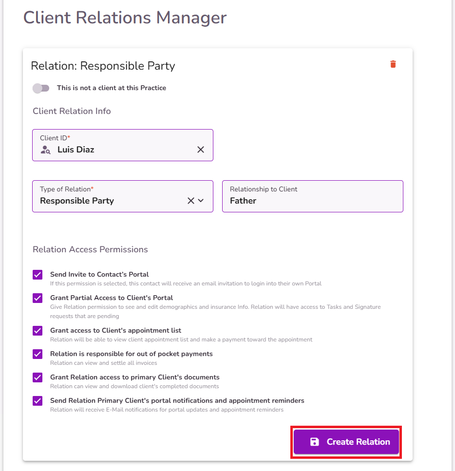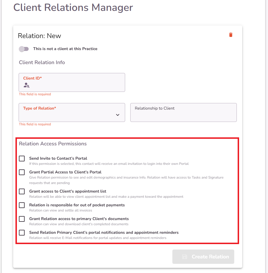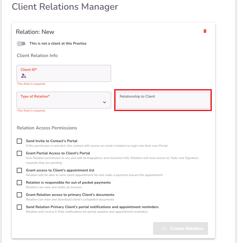 If the relation is not a client at this Practice, turn on the toggle and fill in the Client Relation Info.