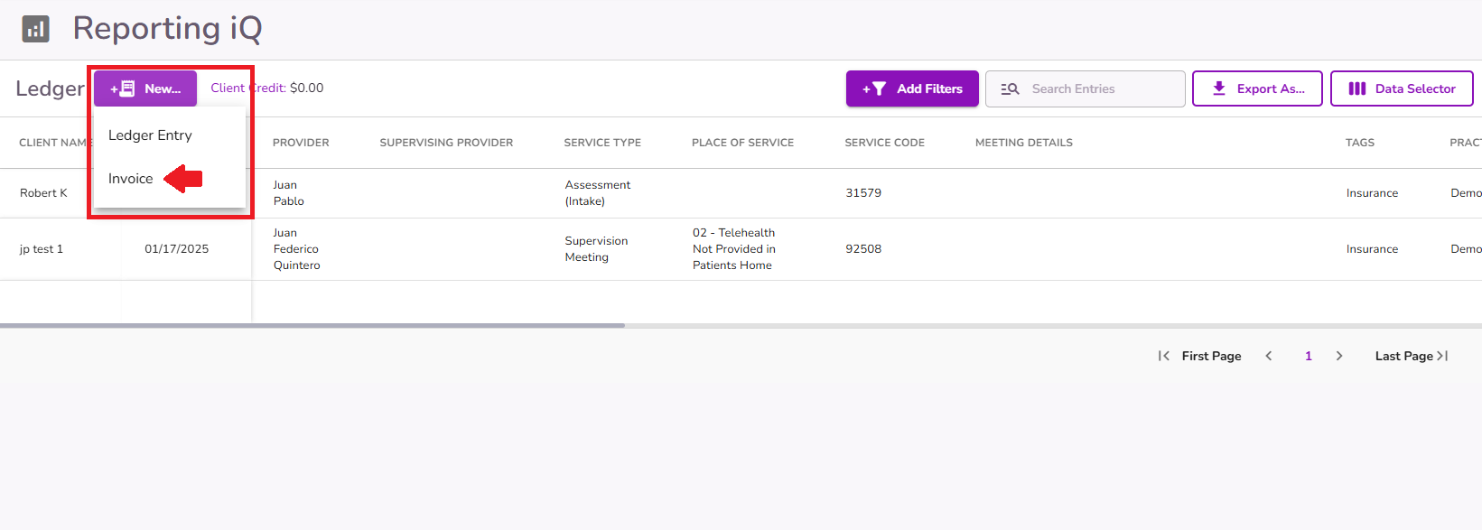 Invoices in TiQ are generated from appointments. Each time an appointment is scheduled, an invoice is automatically created in the client’s ledger with related details from the event, such as services, treatment team, dates, balances, and more.