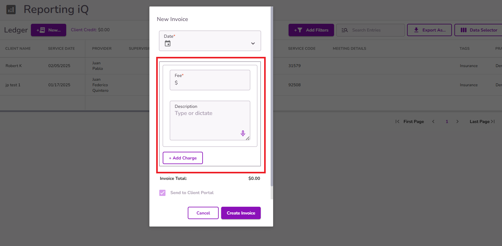 If needed, you have the option to add more than 1 charge to the same invoice. In this case, a single invoice will be generated showing the total balance along with the corresponding descriptions under the Service Code column.