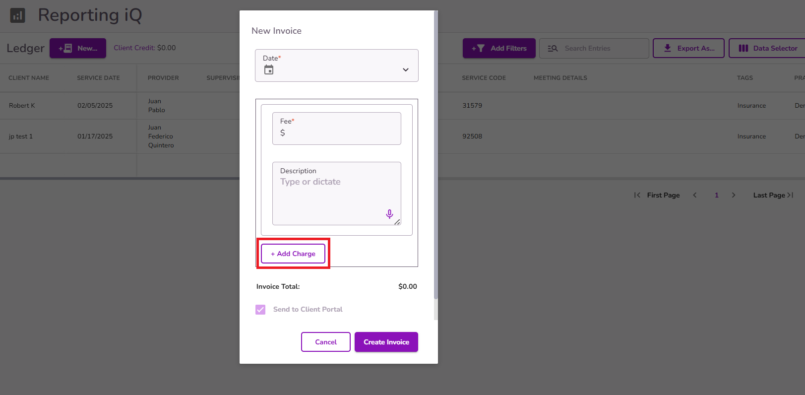 In cases where you need to create an invoice directly from the client’s ledger (for example, to record an appointment or charge that was not originally tracked from an appointment through TiQ), you also have the option to generate one manually.