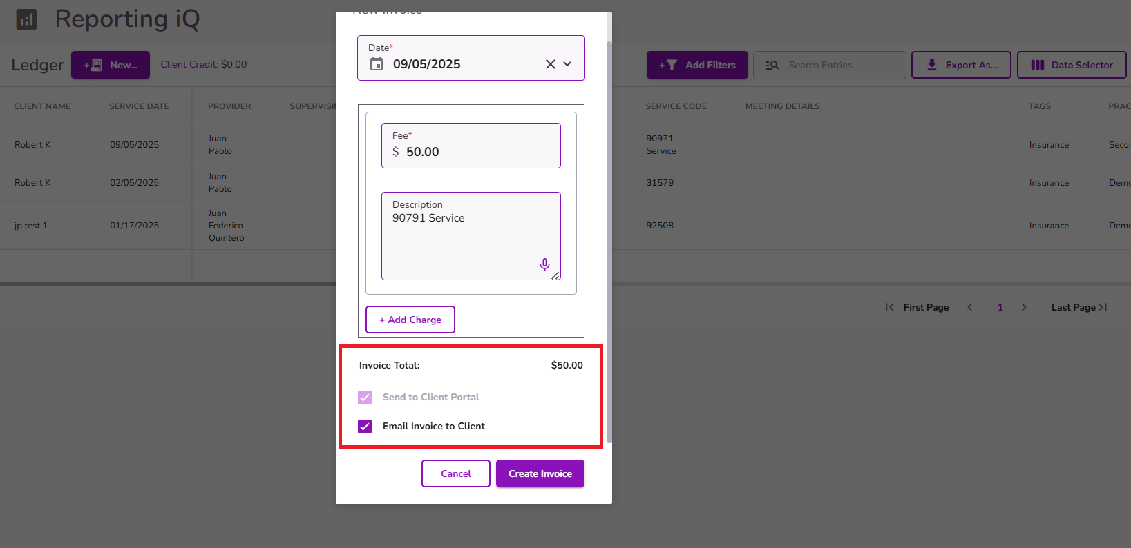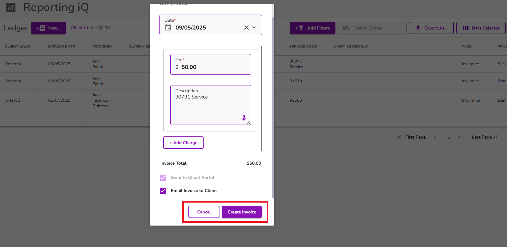 Once everything is added, select Create Invoice to generate the invoice in the client's ledger and reports.