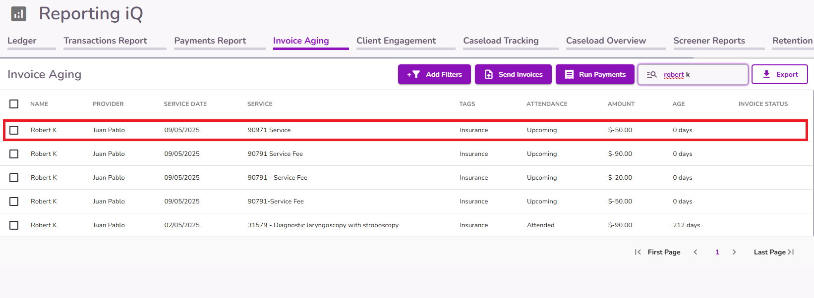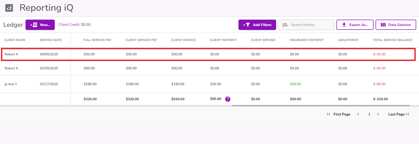 Once the invoice is created, a line item will appear in the client’s ledger showing the invoice amount details.