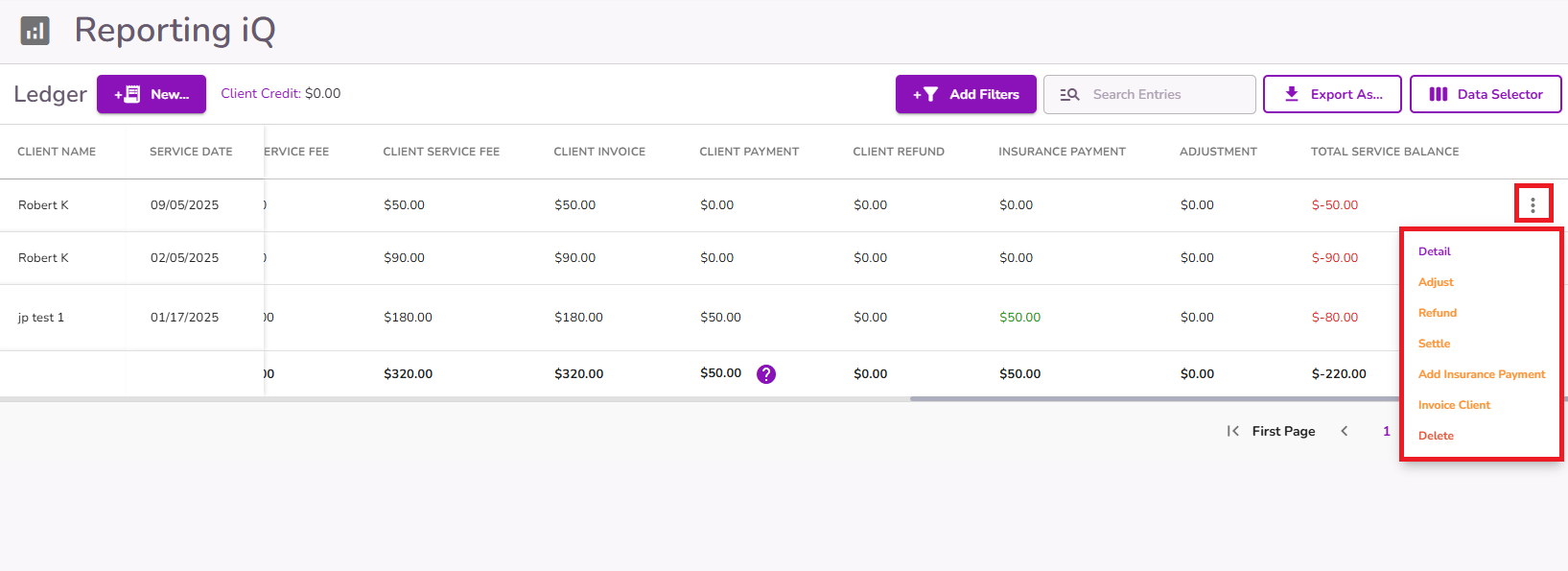 From the client’s profile, open the ledger by clicking See All Billing Transactions under the Billing Overview dropdown.