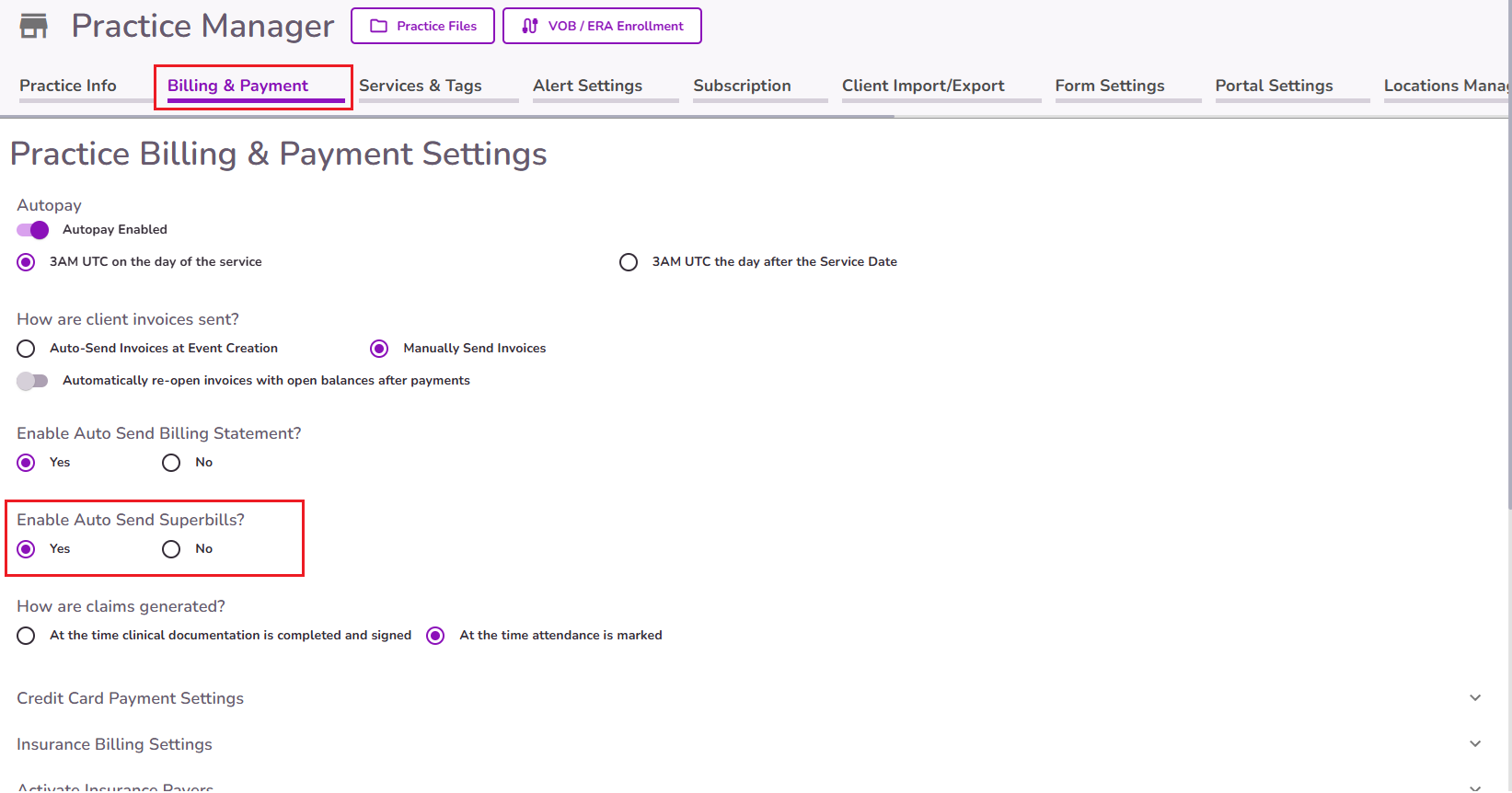 Navigate to the Billing & Payment tab and locate the "Enable Auto Send Superbills?" section.