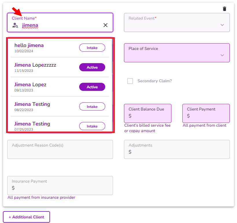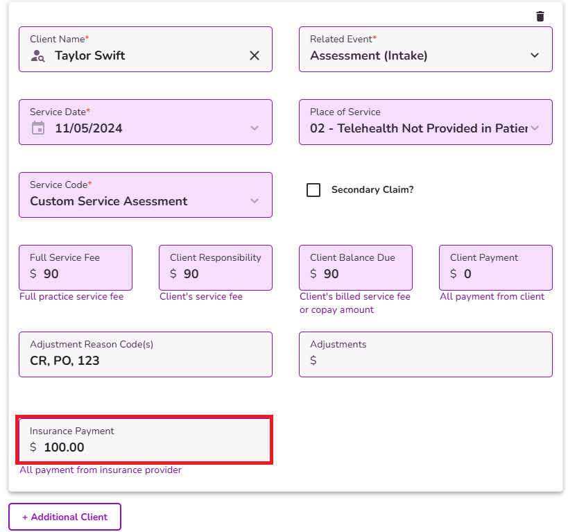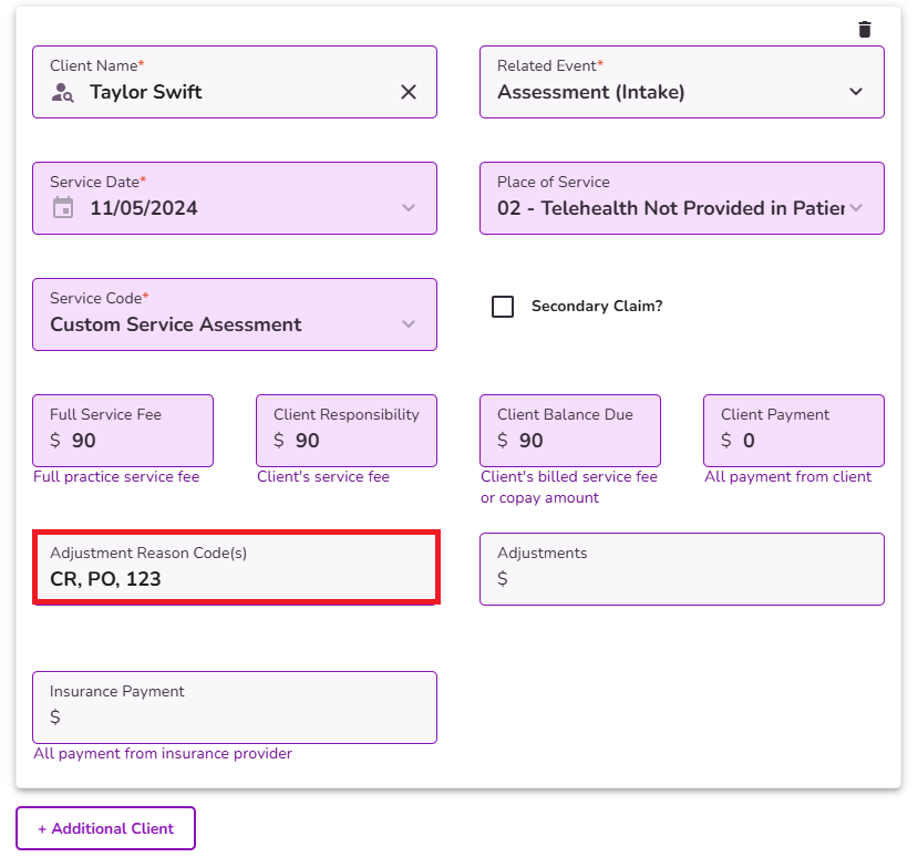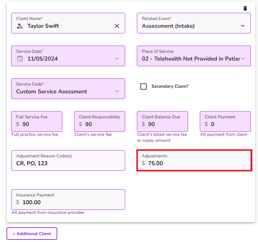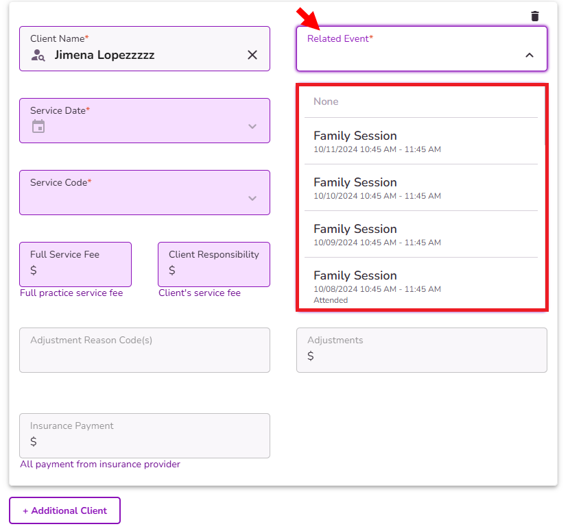 The remaining fields (Service Date, Service Code, Full Service Fee, Place of Service etc.) would auto-populate based on the related event details.