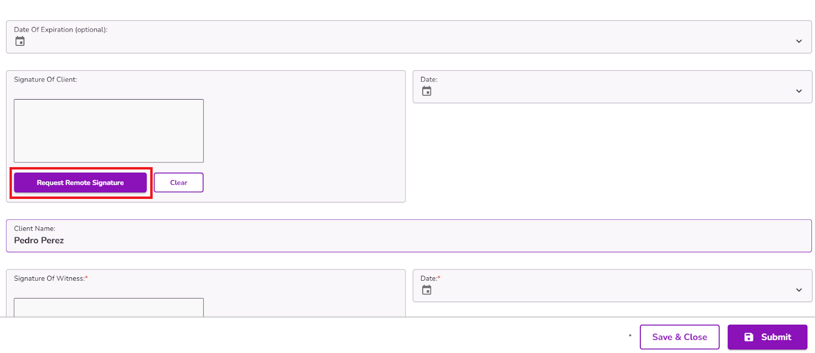Alternatively, you can open the documentation by clicking the corresponding form from the list. This will display the actual form; from there, scroll down to the client signature section and click Request Remote Signature.
