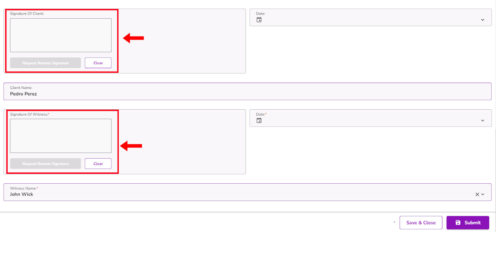 Once submitted, the form will automatically update to reflect the client’s signature.