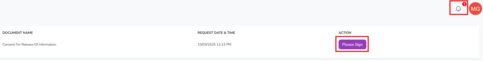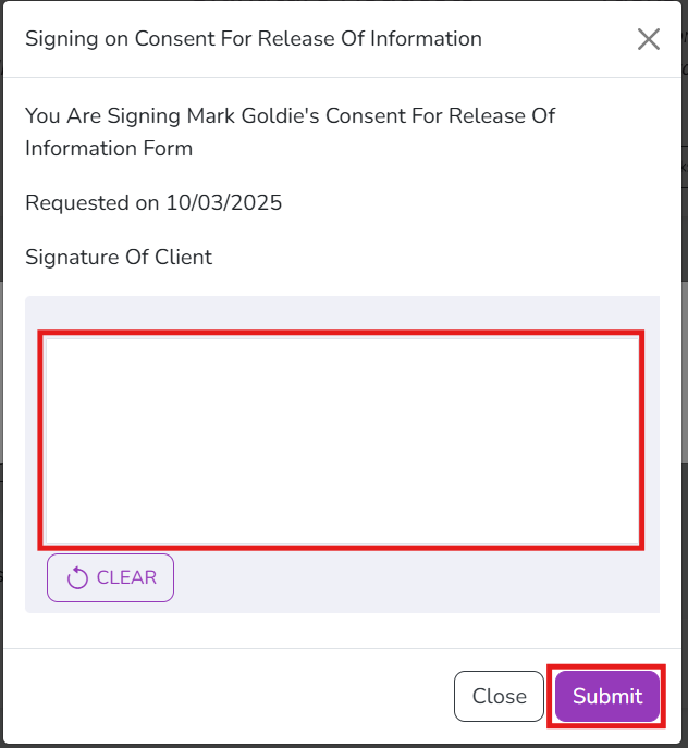 Note: The client will receive an email and an alert within their Client Portal that will provide a link to sign the form. The client can sign in the provided field and submit.