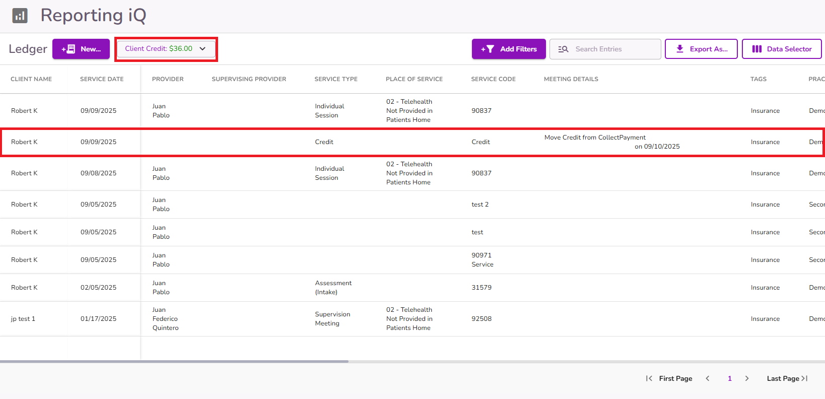 From the client’s ledger, any created or available client credit balance will be displayed at the top.