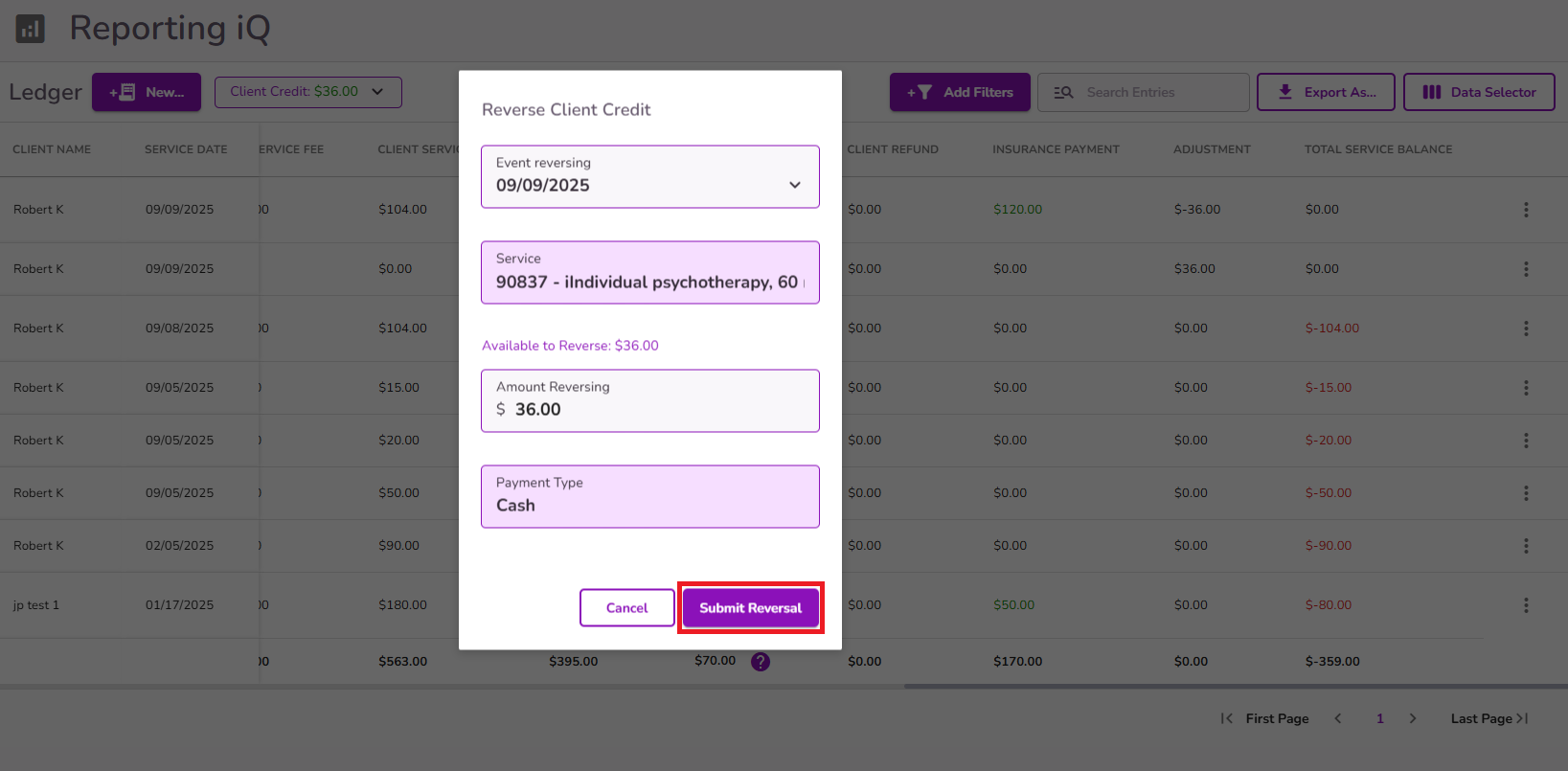 When a client credit is created this way, users can also reverse the amount back to the original date of service where the positive balance occurred. This action restores the credit to the original appointment.