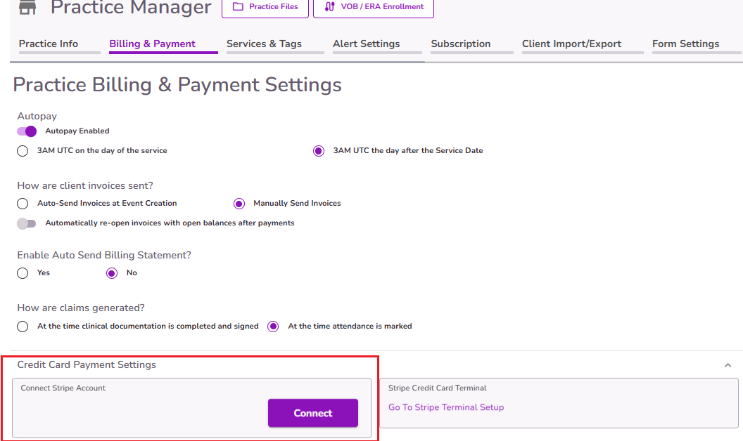 Select Billing & Payments tab. Then navigate to Credit Card Payment Settings and select Connect