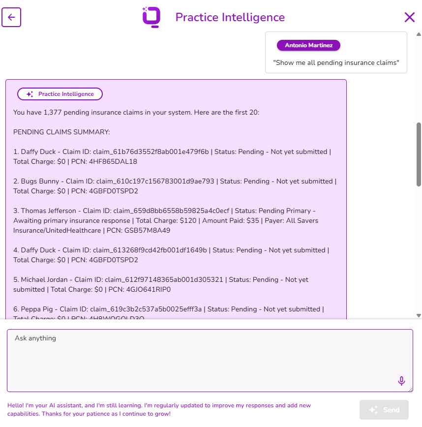 Practice Intelligence iQ is an AI-powered assistant within Therapy iQ designed to provide users with client-specific insights and information. PI maximizes the use of client profile, ledger data, and insurance details to answer queries, create new records, and summarize financial or insurance information.