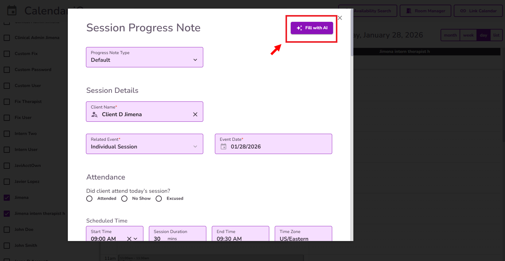 Inside the Progress Note, you’ll see the Fill With AI button available.