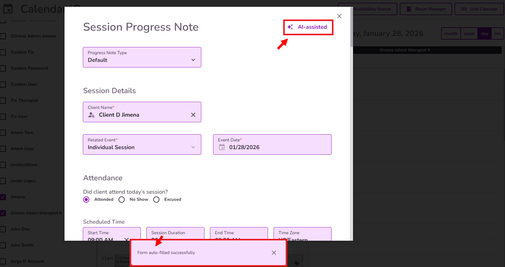 Once the process is complete, you’ll see the message “Form Auto-Filled Successfully” at the bottom of the screen. At the top of the note, you’ll also see AI-Assisted, indicating the Progress Note was completed using TiQ AI.