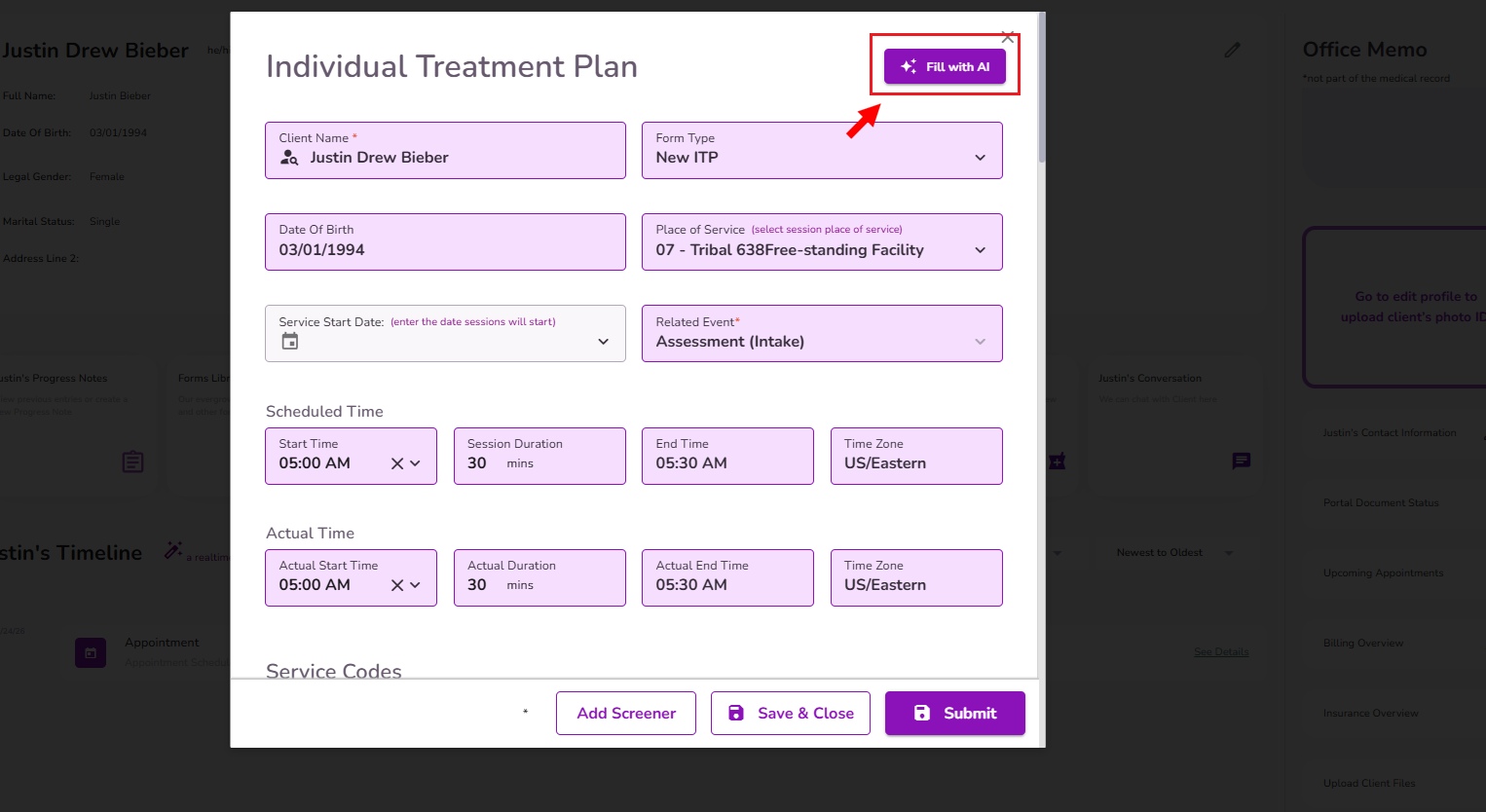 Inside the Treatment Plan, you’ll see the Fill With AI button available.