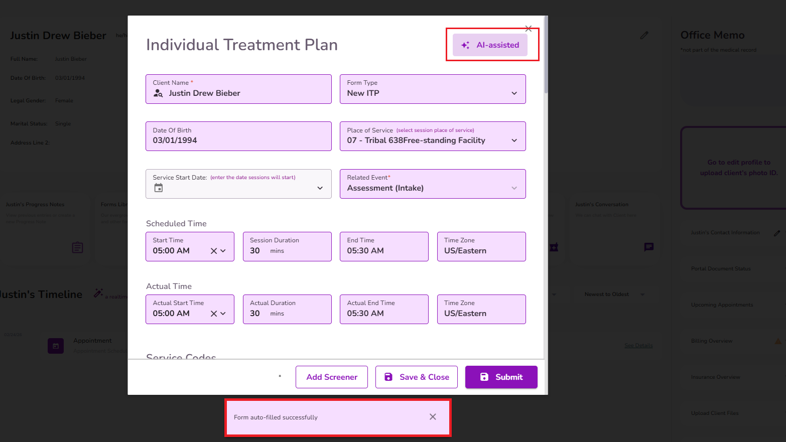 When you click this button, our AI will use the information gathered during the session to automatically complete your Treatment Plan. Once the process is complete, you’ll see the message “Form Auto-Filled Successfully” at the bottom of the screen. At the top of the document, you’ll also see AI-Assisted, indicating it was completed using TiQ AI.