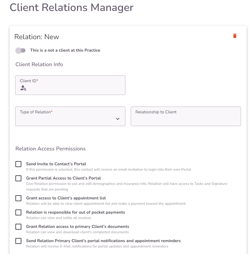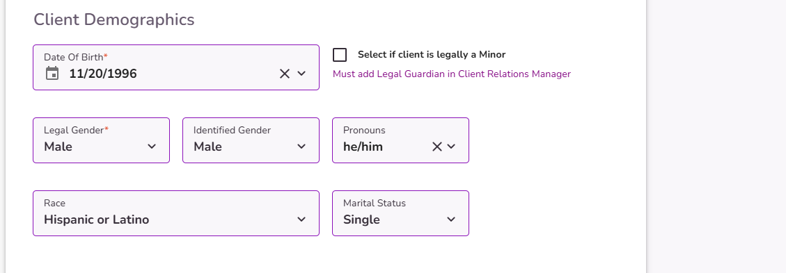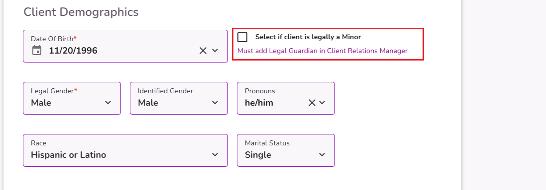 NOTE: By selecting the checkbox ‘client is legally a Minor’, a contact will be required to be added under the Client Relations Manager tab. Click here to learn more about the Client Relations Manager