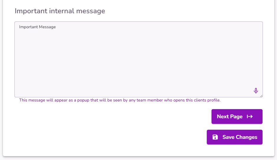 Next Page: This button will help you to move to the next page. IMPORTANT: This button will not save information, don’t forget to select ‘Save Client Profile’ before selecting the ‘Next Page’ button.