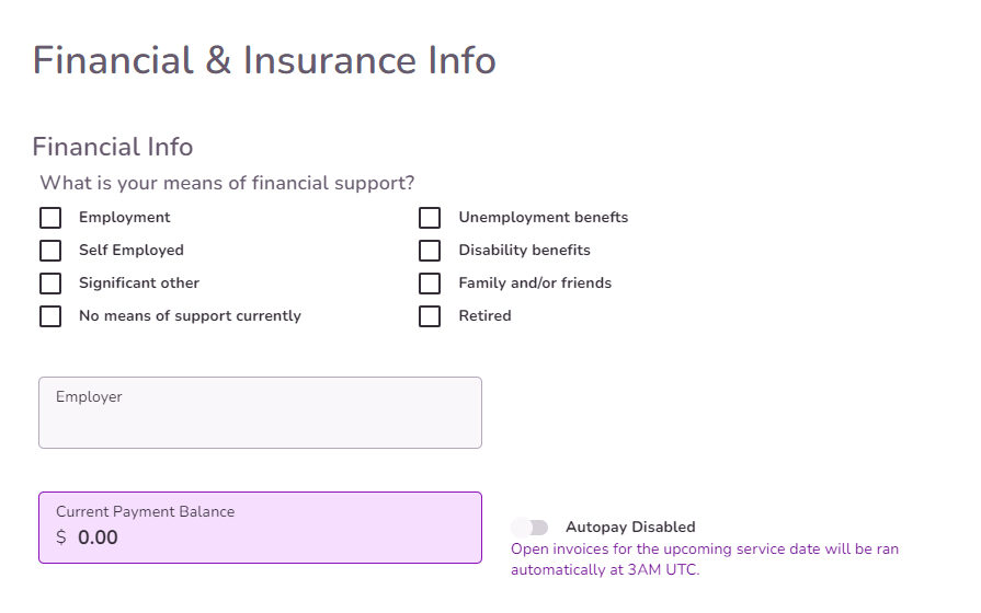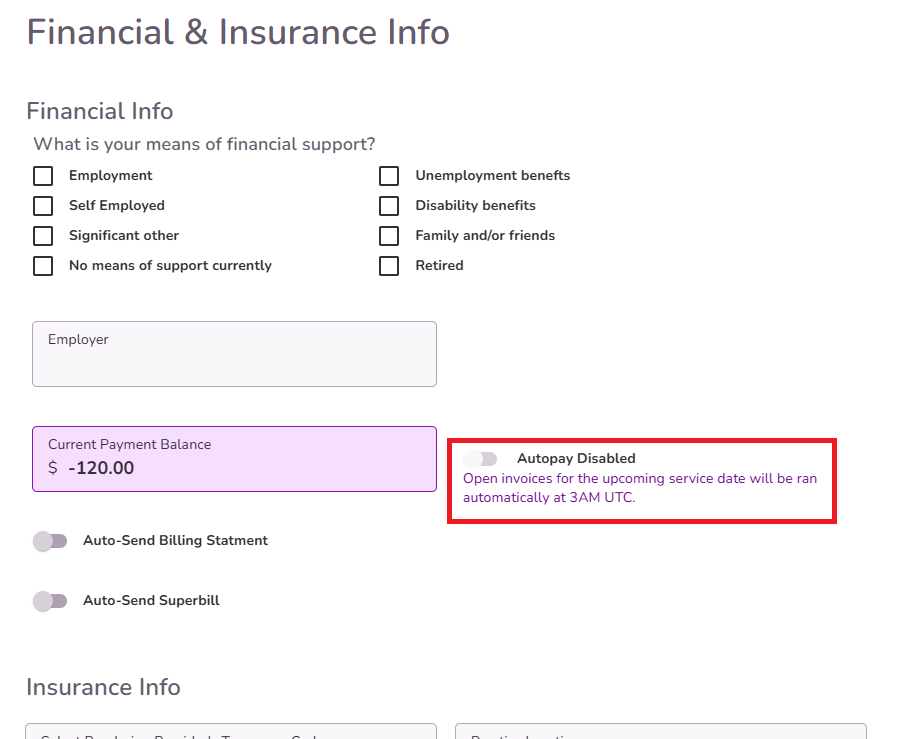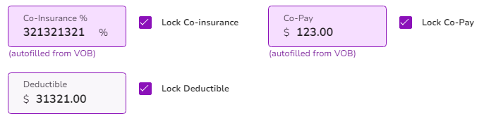 NOTE: Coinsurance, Copay, and Deductible field amounts will be auto-filled from verification of benefits or can be recorded manually for each client - this information will autofill your options for client invoices when scheduling appointments.