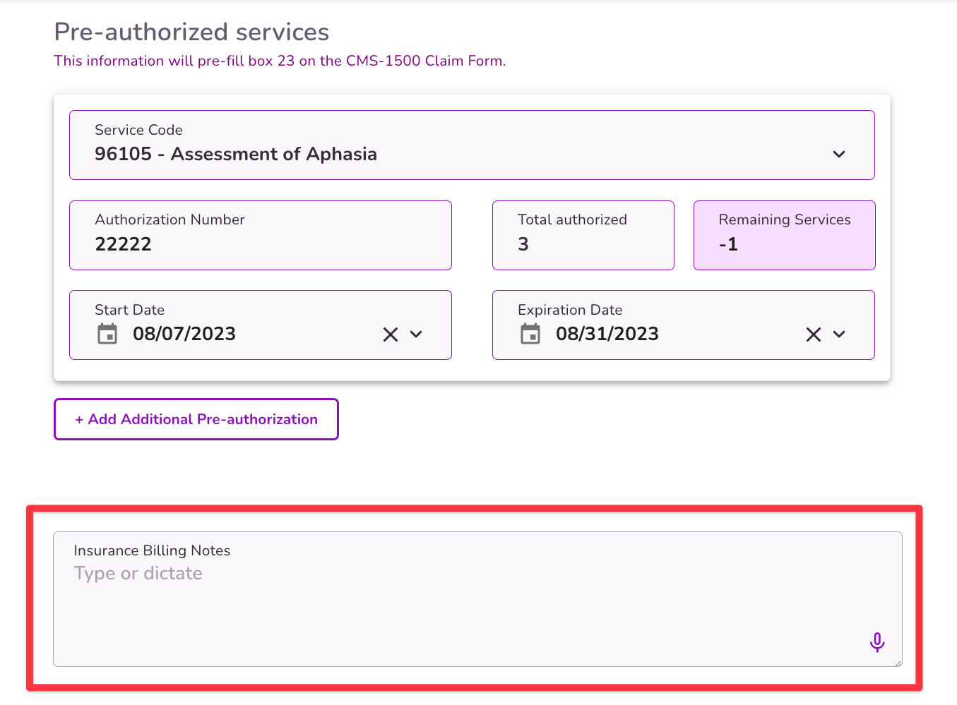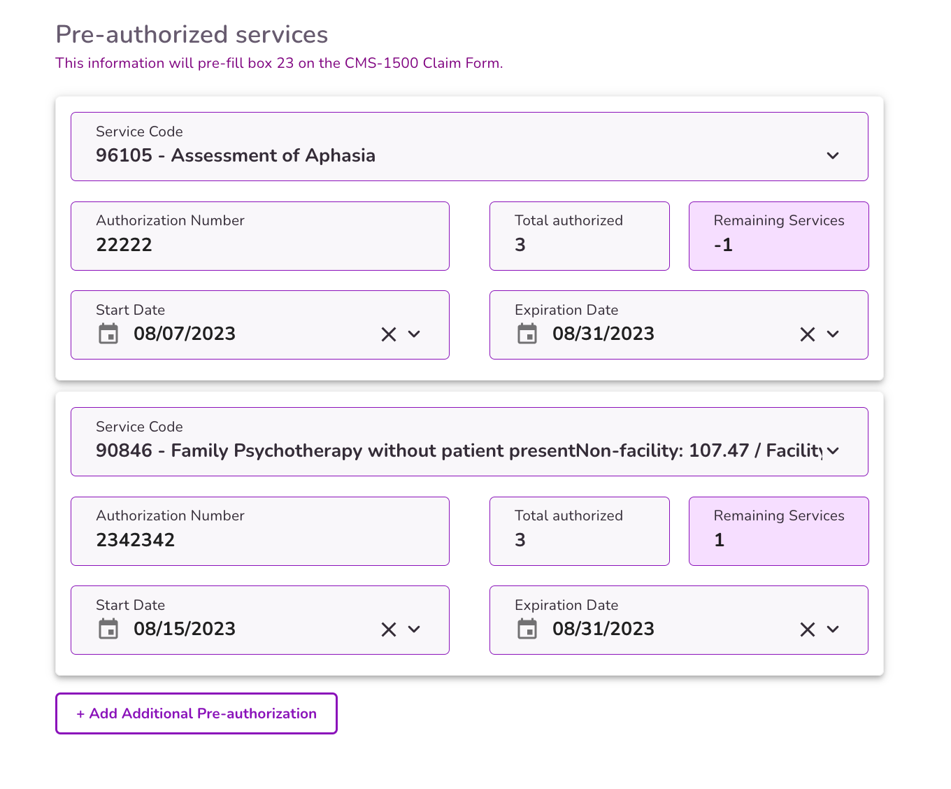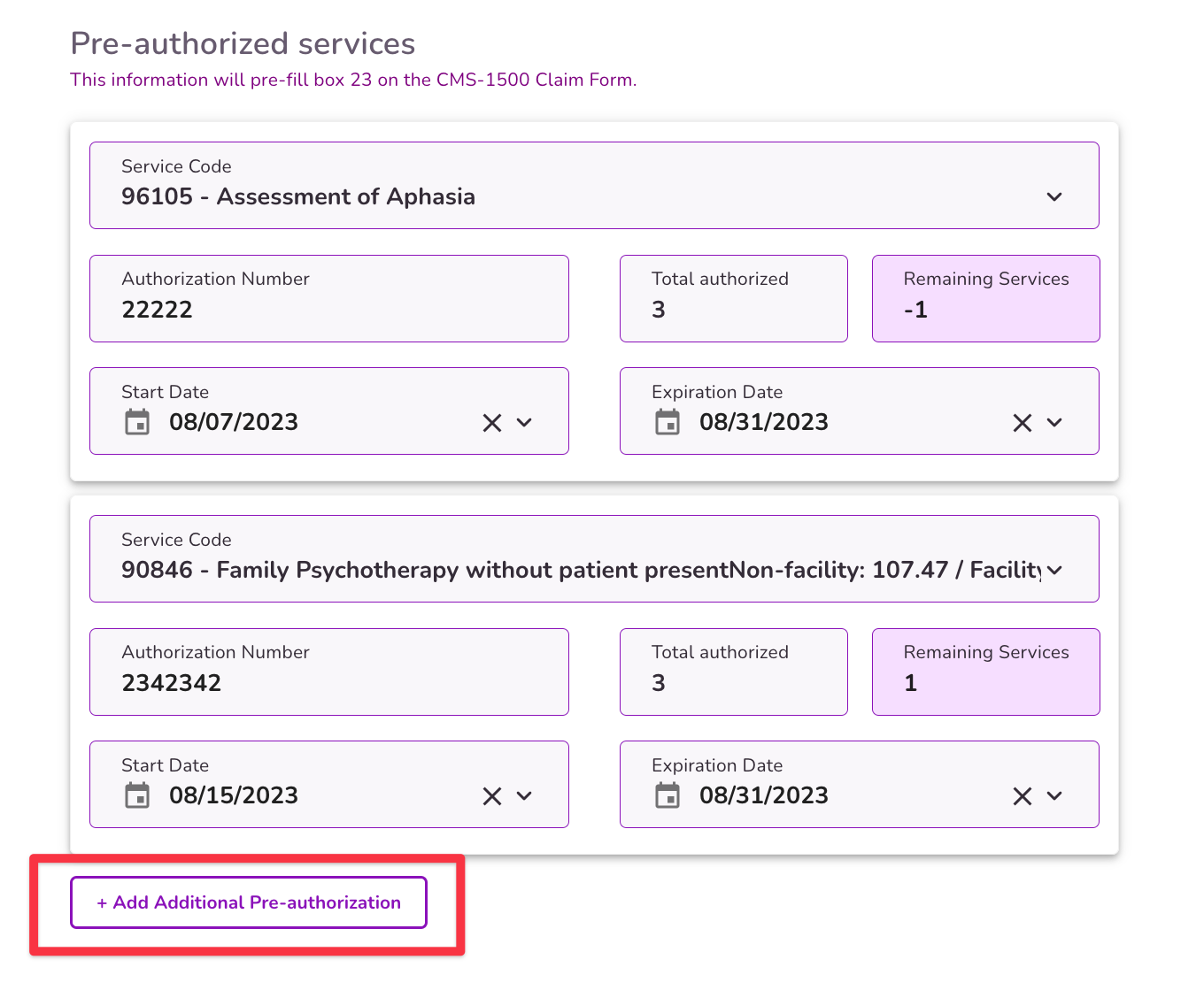 Select the + Add Additional Pre-authorization button to add more services