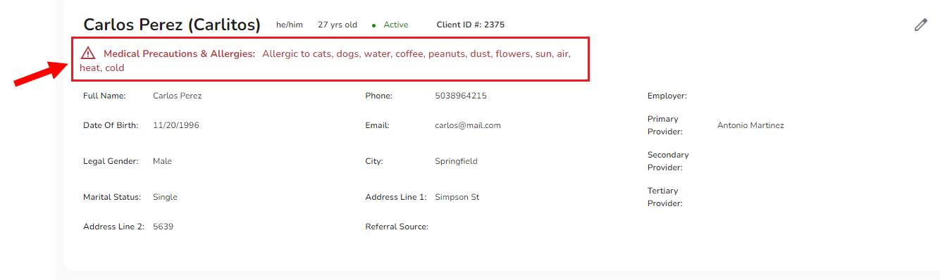 IMPORTANT: The Medical Precautions and Allergies added here, will show up in red on the main client profile page.