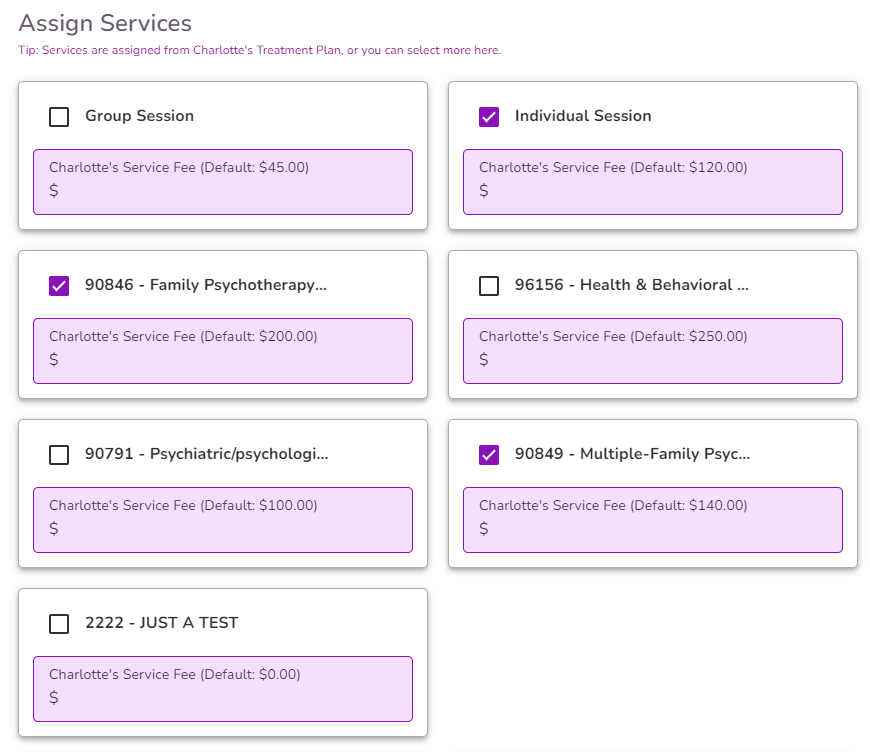 NOTE: Services are assigned from the Client’s Services Agreement, or you can add more by selecting the checkboxes. Click here to Understand how to assign services and fees to a client.