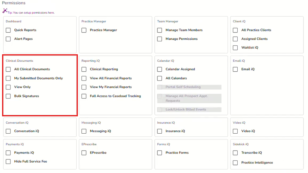 IMPORTANT: The All Practice Clients permission must also be granted to visualize all clinical documents for every client.