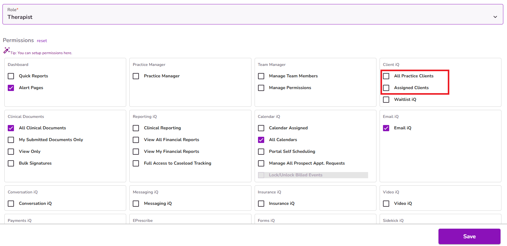 Within the Permissions section of a user profile, under the Insurance iQ box, you will find the Insurance iQ checkbox to grant permission.