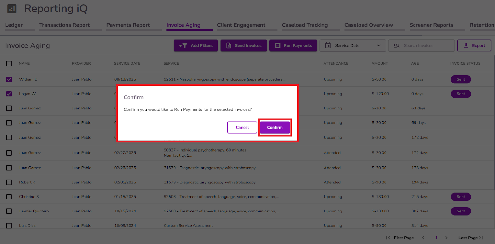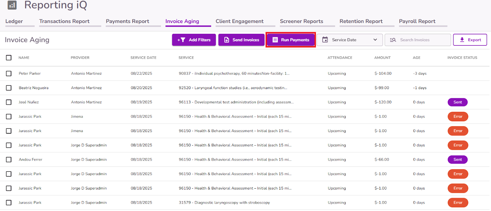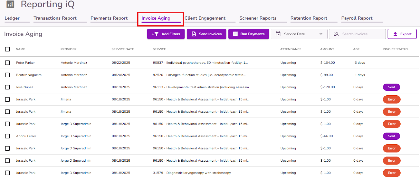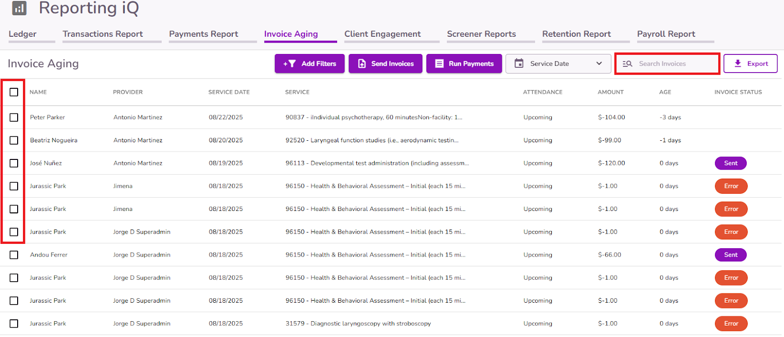 On this page, you can sort by: Name, Provider, Service Date, Service, Attendance, Amount, Age, Invoice Status.