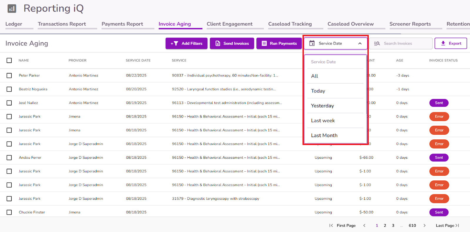 You can filter by: Service Date, Provider, Tags, Attendance Status, Service and Invoice Status.