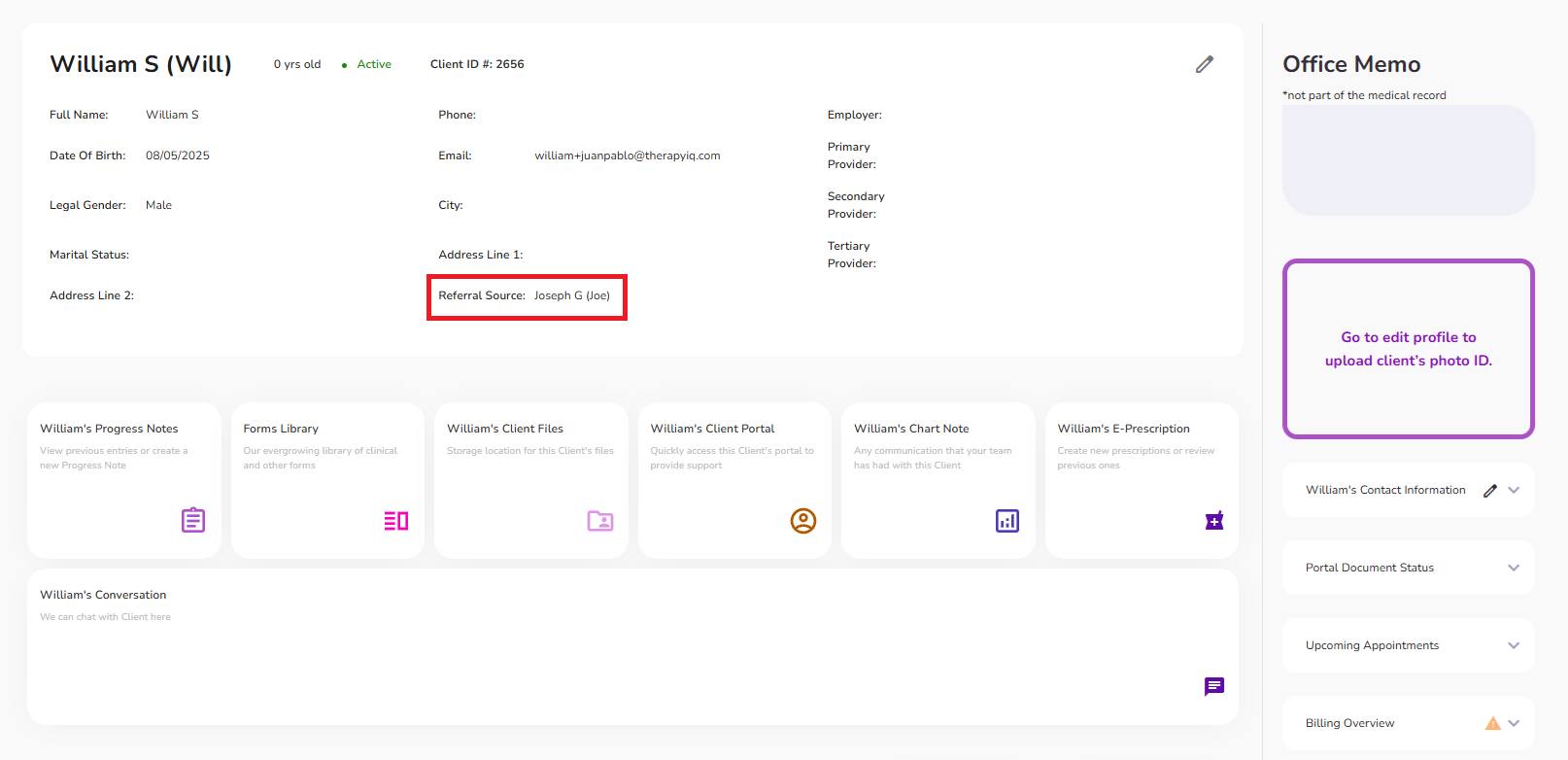 Note: Adding a client relation as a "Referral Source" will display this information in the client’s profile overview.