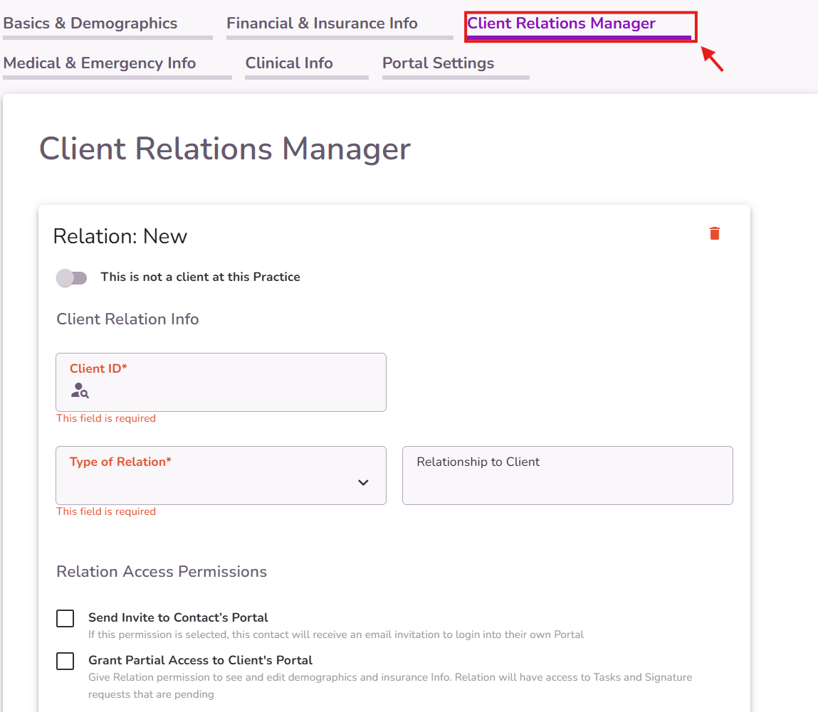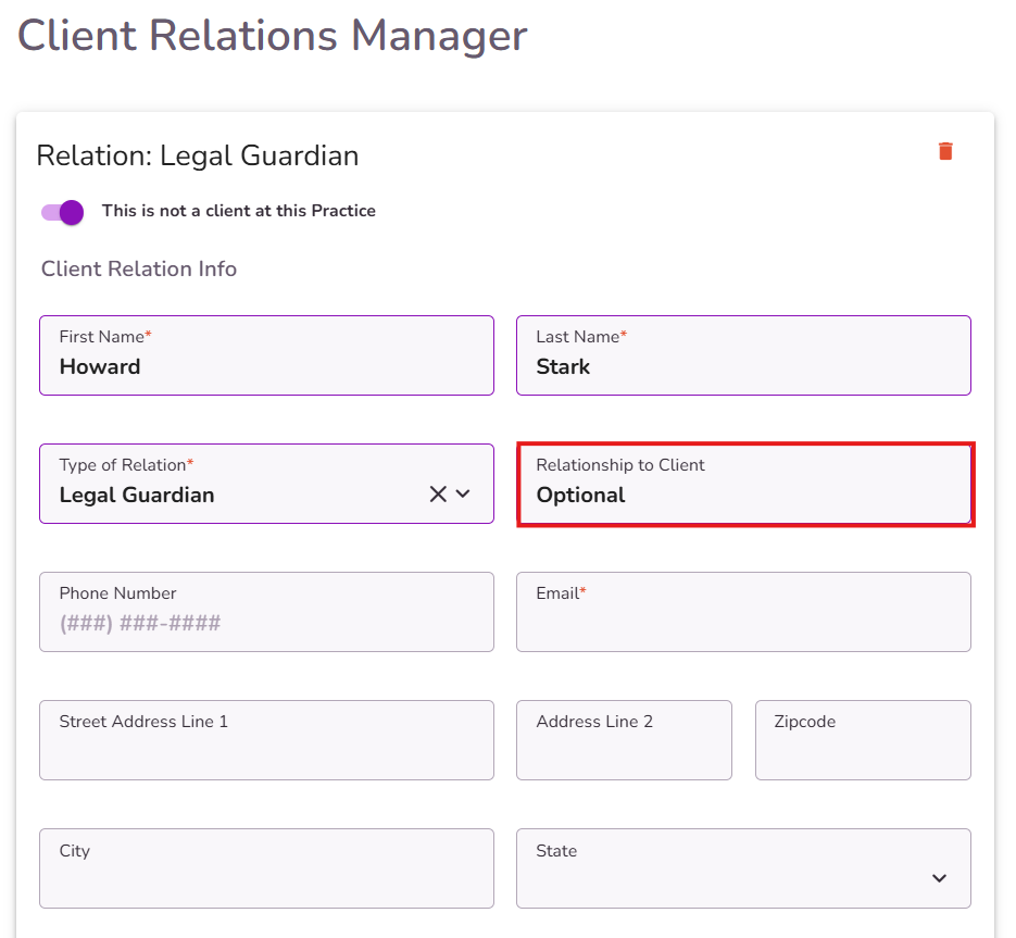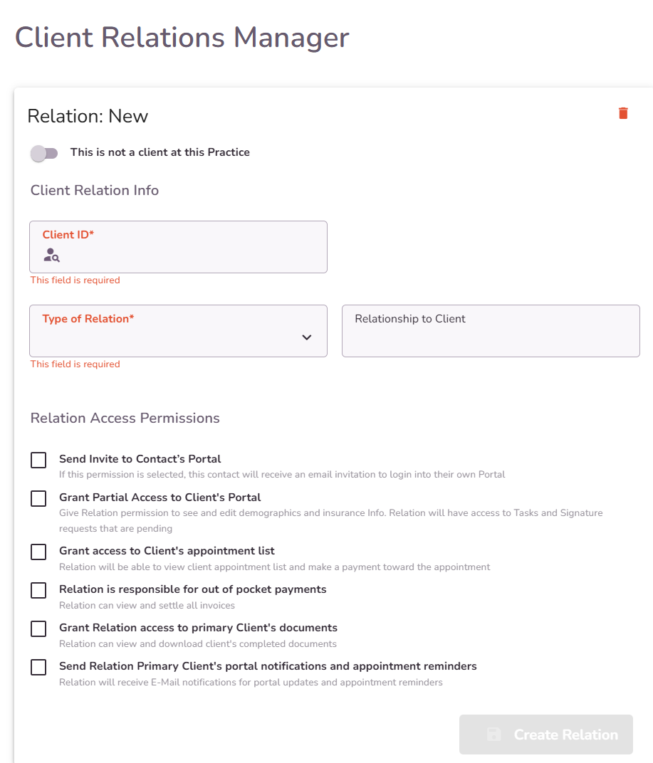 If the client relation being added is not a client at your practice, turn on the “This is a not a client at this Practice” toggle.