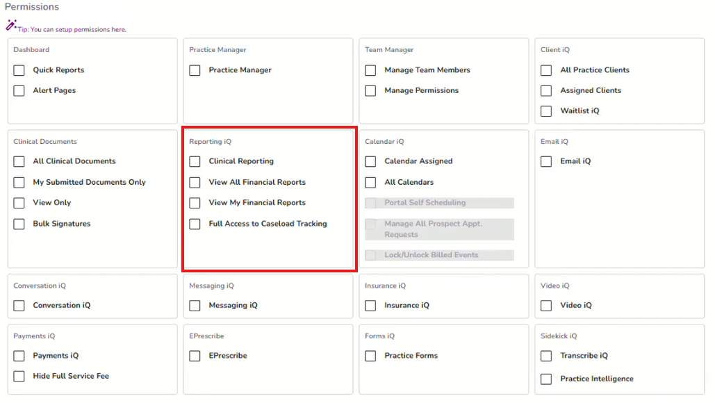 IMPORTANT: Enabling any of the Financial Reports permission will automatically activate the Lock/Unlock Billed Events permission in Calendar iQ, allowing users to manually lock or unlock appointments. If the no Financial Report permission is selected, the Lock/Unlock Billed Events permission will be permanently disabled and grayed out.