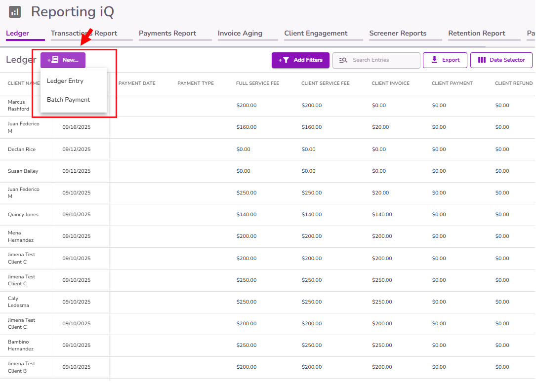 The +New button allows you to add manual ledger entries (entries that are not tied to events in TiQ), and Batch Payments.
