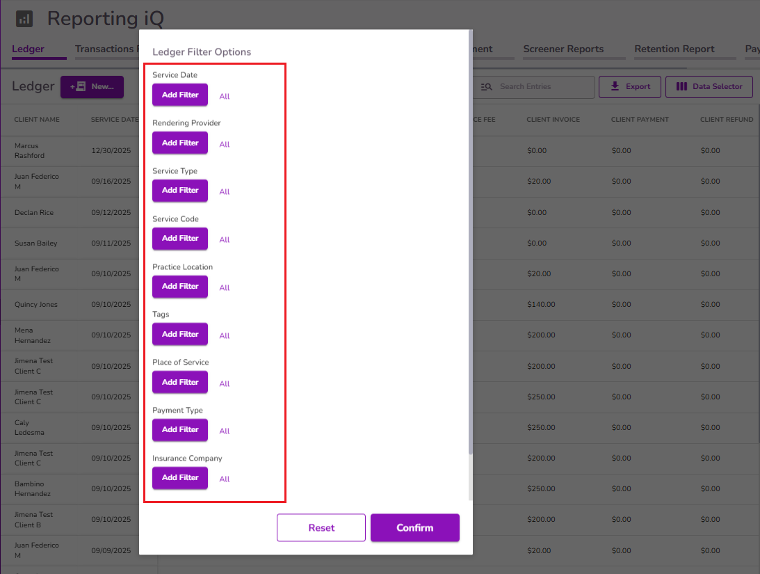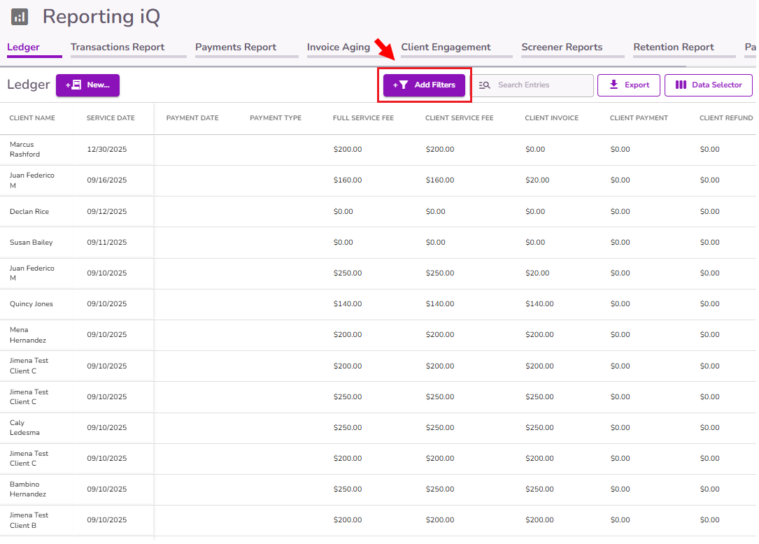 NOTE: Any filters you've applied will also be applied to the ledger export, as well as the columns you've selected with the Data Selector.