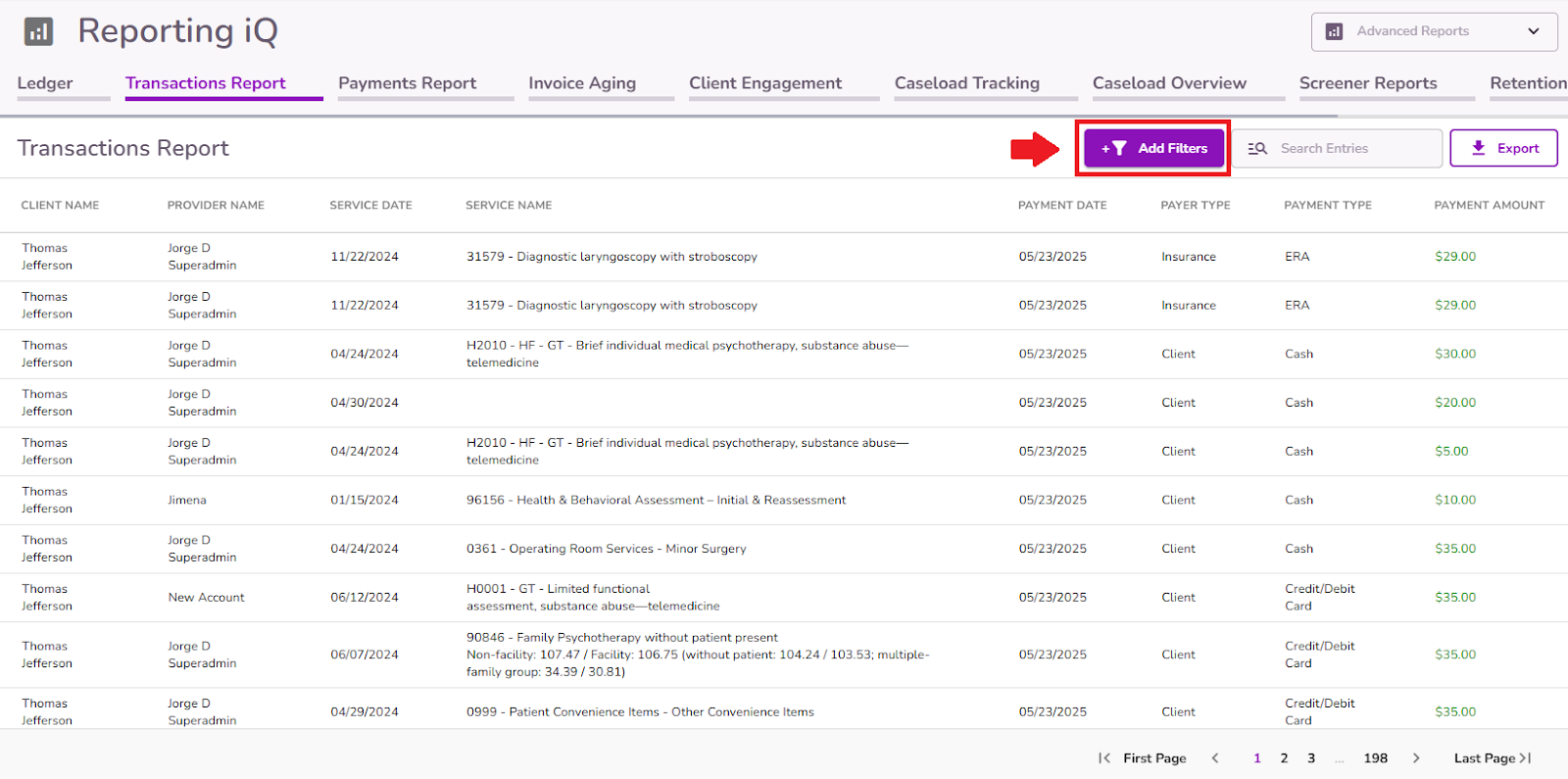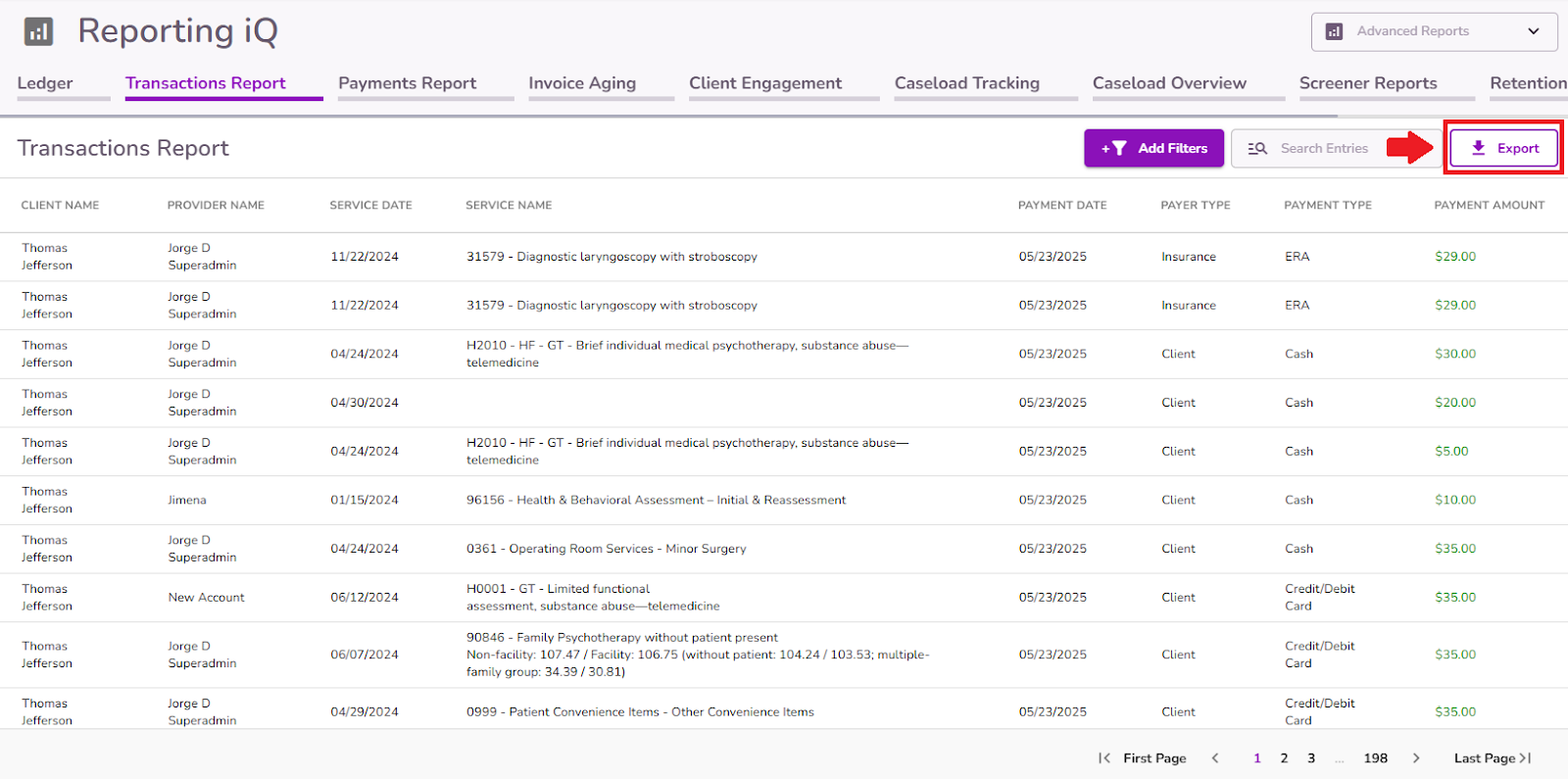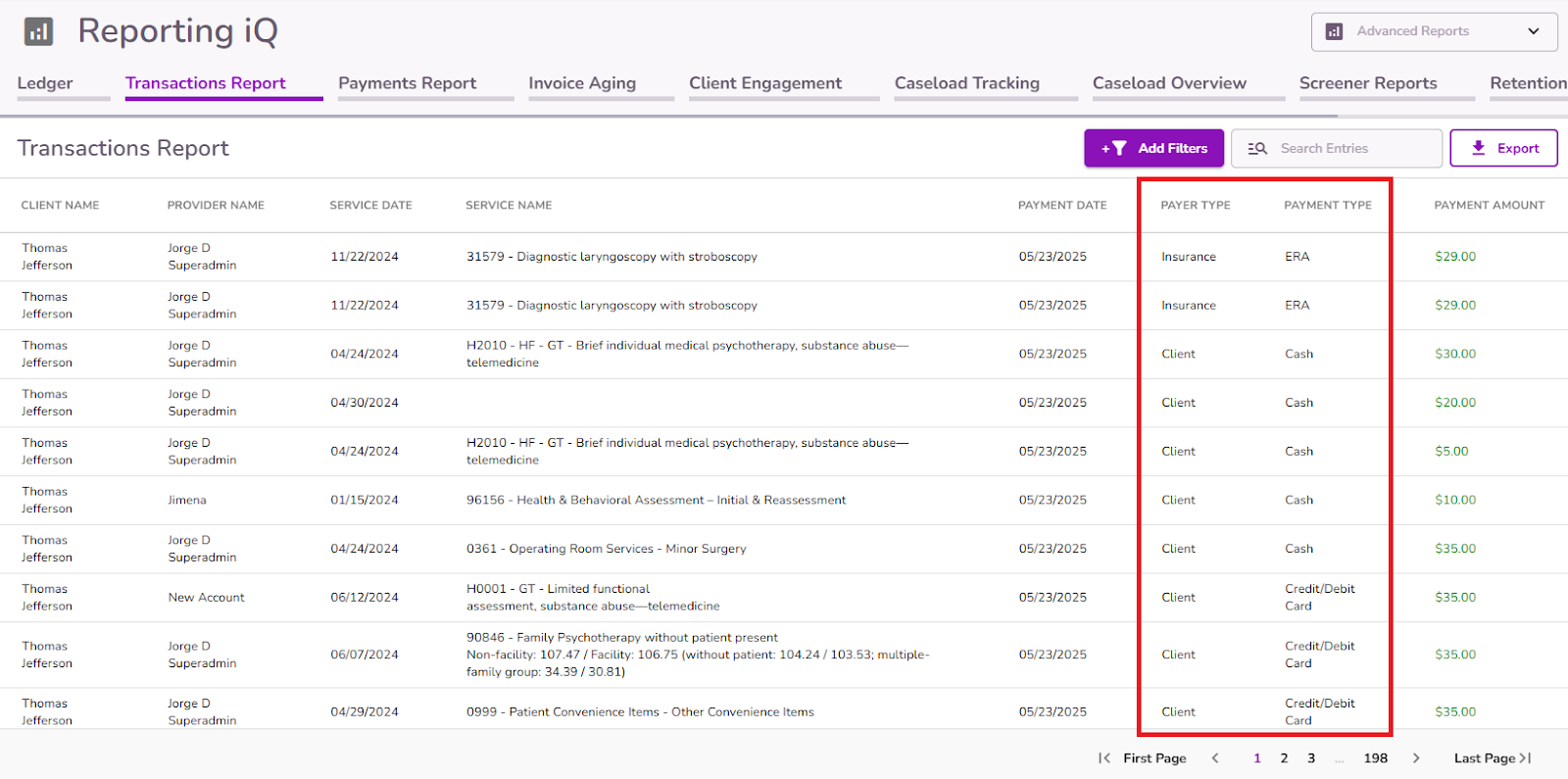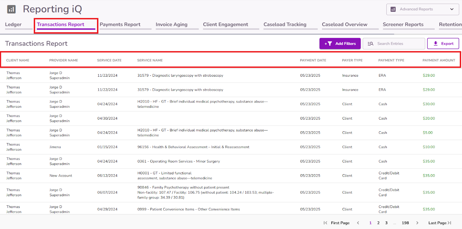 From Reporting iQ, users with the appropriate permissions can access the Transaction Report tab. This report offers a detailed overview of all payment transactions recorded in the Ledger, including both client and insurance payments. It captures key information such as client name, provider, service date, payment type, payer type, and payment amount.